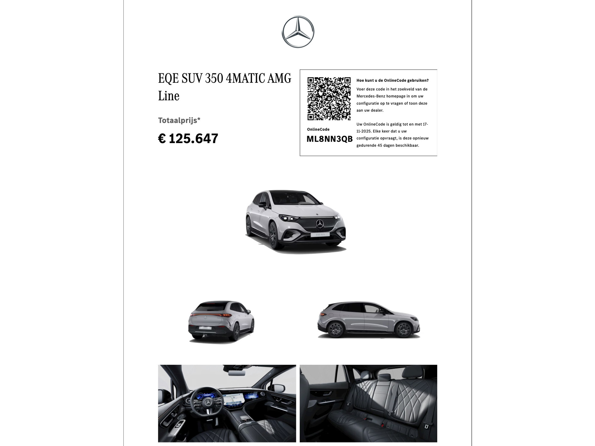 - Type:EQE 350 4MATIC AMG Line | NIGHT | € 66.100 ex BTW | Alpingrau | Nappaleder